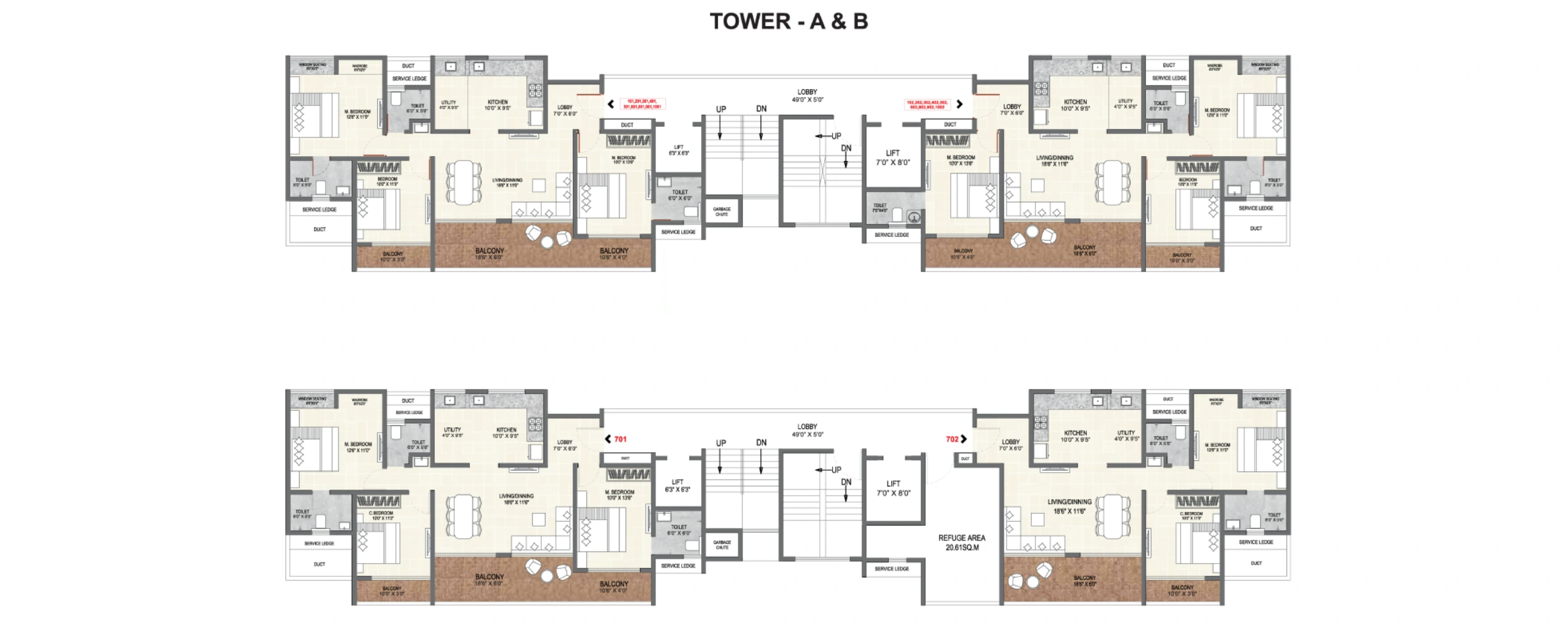 - Flooring : 800 X 800 mm Vitrified Double Charge Tiles & 600 X 600 mm Anti-skid Vitrified Tiles for Dry Balcony
